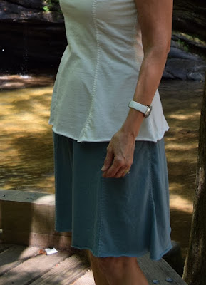 I like.... no love..... both pieces separately, but am not keen on them together. The skirt is the most comfortable skirt, and the Alabama Chanin organic cotton jersey is the softest cotton jersey fabric against the skin.... but the skirt feels sort of 'full' at the waist and grabs the jersey tank top and makes me feel a little frumpy? Not that flattering on my figure, maybe? Anyway, the skirt is mostly worn at home and is most loved for the comfort it affords. I will say, now that I've got a couple of simple AC garments under my belt, feel I am better prepared to tackle a more challenging project. Am also finding that I love the hand-stitching process.