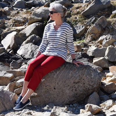 It was fun to make Ottobre's 05/2016 no. 15 'Like a Warm Hug' with its exposed serged rolled hem seams center front and center back.  I'll let you in on a little secret here..... I was trying to act all cool and nonchalant in the photo below, but was actually so stressed as there were *gasp* PEOPLE nearby!!!!  Still not comfortable about photos in public, but do force myself out of my comfort zone occasionally and take 'on location' shots with my camera and tripod.