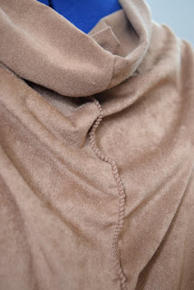 Again, center front and center back have exposed serged rolled hem seams and with this drapey, slippery ultrasuede, it almost has a ruched effect.   This time 'round I lengthened my serged rolled hem stitch length and instead of a satin stitch rolled hem finish.....