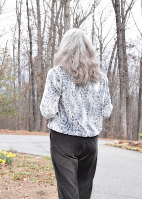 This is a size 38 with the upper back neck area narrowed a bit. Seems to be something I always have to do. Otherwise no modifications. Worn here with the NewLook 6216 gray corduroy pants and the Ottobre draped top.