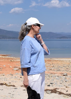 Wearing my white Ottobre pants. Need to make another pair as am wearing these constantly. Today's photos were again taken at Lake Jocassee at Devil's Fork State Park. It was a little disappointing to see the water so low, thus the red clay peeking out in the background here. Usually this area is under water with a sliver of a sandy beach.