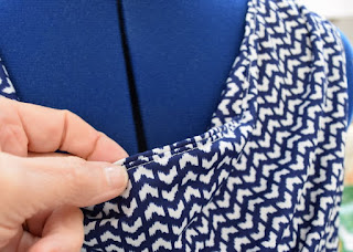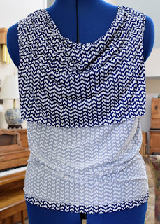 When I first made this top in 2013, I cut a size 8 and sewed a 1/4"/serged seam.... so that's what I did here too..... because I had actually cut the pattern sheet, something I rarely do now. What's curious to me, is that I never would've cut an 8 today as according to the pattern envelope's measurements I should be wearing a size 12 sewing a 5/8" seam. Yet this top fits perfectly. Anything larger would be too large and not give me this type of 'fit'. So sometimes not knowing what you are doing is a good thing?! :) By the way, all that draping down at the back waist does not bother me a bit. Probably need a sway back adjustment, but this is a little fun top that was a quick and simple make. Didn't want to make a mountain out of a mole hill with this project. This project takes about an afternoon or two.