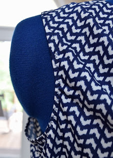 The shoulder seams were stabilized with an iron-on fusible, but I did not think that would be enough, so I cut 1 1/4" strip of a coordinating non-stretch polyester from the stash that just happened to be the perfect color match to my knit, and sewed an enclosed bound seam there. About this time, Sue made a very sweet remark on IG about how neat I make the insides of my garments....... so the pressure was really on to reach that benchmark of a kind compliment! (Thank you Sue!) So all interior seams are french-seamed... and you know what..... double seaming each seam in a french seam, also super stabilized those seams! Double win!! You can see the arm seam and side seam below. Even though this knit fabric was stretchy, it was fairly easy to sew.
