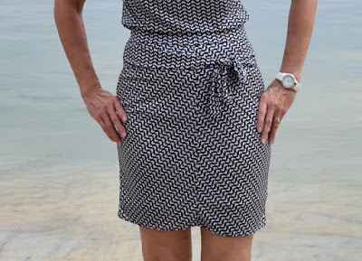 Megan Nielsen is an Australian designer and this is the first pattern of hers I've made. You can see more about this pattern at her website here. There are three versions of this cute skirt, and I chose the one on the very far left, Version 2. What I found most interesting about this pattern, is that it's built on negative ease and the waistband has nary a piece of elastic nor zipper. It's all about the knit fabric holding everything up and all together. I had a piece of Hobby Lobby knit originally planned as a drapey top, but thought it'd make a great Axel skirt. And I think it did. Wanting to stay true to the pattern, I made it as instructed, with the exception that I had to narrow the side seams to 1/4" from hip down as I felt it was too tight. Then afraid my drapey spandexy knit might be too clingy and curve-showing, I lined mine with a poly interlock purchased from my local Wal-Mart. I cut a Small.