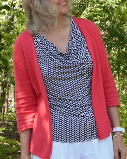 And here's how I began this day. The coral thrifted cardi complements the blue/white nicely.
