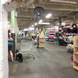 And inside I was floored! This photo absolutely does not justify what I saw at all as there were 2 of these HUGE warehouse rooms/buildings filled with rolls/bolts of fabric from floor to ceiling and rows upon rows of fabric deep. I did not know where to begin. I walked around for at least an hour before I could get my bearings. The fabric was organized well into sections of fiber content..... linen, vinyl, jacquards, taffeta, silks.... but most was of home dec sort.