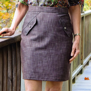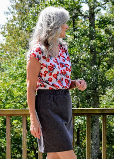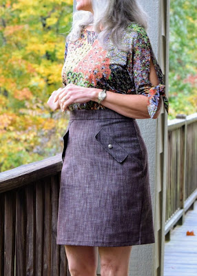 What drew me to the pattern was how the elastic waist seemed to lay nice and flat without any gathers in all the line drawings. My waist is small compared to my hips, so mine seems to gather a bit in the waist area. It doesn't really bother me as this skirt will always be worn with a belt or something like a cardi over the elastic waist. I'm wearing the Ottobre Sculpture top with it today sans cardi to show you the details and fit.