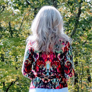 And don't care one hoot about the pooling in the back because look at that awesome fabric pattern matching!! Yes!!!!! When purchasing the fabric I thought it had a generic non-repeat pattern..... but nooooooo it was a most definite eye-catching pattern in this fabric that was very prominent when trying to cut everything out. Great care was taken in placing all pieces..... though my hair covers a bit of the back, you can still see the image is centered. And notice how the back of the arms even match! I am so happy!! If you scroll back up and look closer at the front photos, you'll see how they are symmetrical too. :) This top will gets lots of wear!!