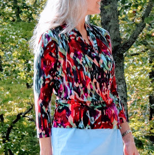 There are 2 different views Burda shows of this cute top.... one here, and the second here. When I first received my September issue, this cute top immediately caught my eye but feeling so wary about the gaping issue, was hesitant to make it. In Burda's photo below left, you can see how the faux wrap ends in the side seam.... but under the waistline.... more in the hip area.... and that concerned me.... until I recently came across Hila from Saturday Night Stitch's YouTube video version of this top where she shows her first version that looked like she may have moved the 'wrap' up higher... to hit more under the bust at/above the waistline and really liked it. (Her 2nd version is a lower hitting 'wrap') She also spoke of the tightness at the hips and tightness in the arms. She's so little and in such great shape, she didn't need to modify any of that.... but I knew I would need to so graded from a size 36 bust/waist to a size 38 hips. I did not add anything to the arm width because my fabric has a wonderful 4-way stretch but did take Hila's thoughts into consideration and only serged that seam at @1/4" seam allowance. All my other seams are a 3/8" seam allowance stitched on the sewing machine using a walking foot, then run through the serger to 'neaten edges of allowances together'. Oh, and I shortened the sleeves to 3/4 length and shortened the length of the top by 2". But the biggest modification I did was to raise the wrap insertion in the side seams to at/above waist.... just under the bustline. It wasn't hard to figure out and REALLY like the security it affords. I've worn this top for the last 2 days to check out the modesty factor and have to say it's fantastic. No problems at all. Stays nice and shut without feeling restrictive.
