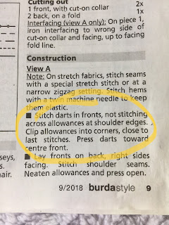 Pondered a while, measuring, matching shoulder seam pieces finally decided to simply follow the instructions to 'stitch darts in fronts, not stitching across allowances at shoulder edges'. So I stopped my dart stitching at the little 1 there in the corner. Then clipped (look for the 'snip here' on my pattern) a vertical snip, through the seam allowance that was not stitched, 'close to the last stitches' on the dart. Worked great! Phew!!