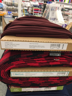 In September 2017, it was immediate 'love' when I felt this lovely velvet-y corduroy wine-colored fabric in Joann Fabric Store and felt it would be perfect for my Christmas dress. This pattern is for a stretch knit and for some strange reason I thought this corduroy had some 'stretch' in it when picking it out in the store, but in the middle of making my dress became very aware that there is nary any stretch to speak of. After referring to my photo below that I snapped in the store the day of purchase, I must've been in some sort of fabric fog when I purchased this, as there is clearly no stretch content noted in this fabric. Thankfully it still worked okay for this pattern.