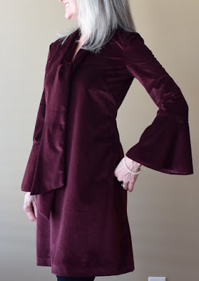 The dress was ironed for these photos this morning and looks much better than the earlier photos. Btw, this velvet-corduroy irons beautifully. With your iron on a lowered heat setting and using a press cloth be sure to iron in the direction of the nap, and do not 'over-iron'. And here is the final result. I cut a size 36 at the bust and waist, grading to a size 38 at hips. Added 1" to the length and included the vertical back darts option on the back pattern piece for a more fitted look. Hem depth was 1 1/4" blind hem stitched by machine. I ended up making the tie collar later Christmas Eve day and love it! The collar is not attached to the dress at all, yet stays nicely 'put' and in place and really adds to the overall design look of the dress methinks.