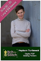 The Itch to Stitch Hepburn Turtleneck pattern in .pdf download costs $10.00 that is truly a bargain considering it is such a well-designed, basic piece that will probably be made in multiples to re-fresh each Fall/Winter season's wardrobe. A keeper! Anyway, to be honest with you it was hard to tell exactly how form-fitting this pattern was designed to be.....