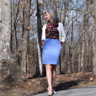 That's it for this week. This little skirt took maybe a couple of afternoons..... deciding how to alter the pattern for the extra width and top-stitching took more time than the actual construction.