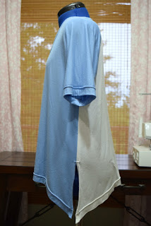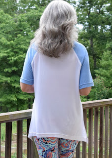 This is a fabric eater needing almost 2 yards..... which I did not have..... so my first mistake was thinking a white knit in the stash, with the same knit properties would be a sort of 'cool' back. Wrong! The first thing both my daughter and husband said when they saw it was that it looked like a 'sport' 'baseball' shirt. Noooooooooooooo! Deflated right then, let me tell ya'.