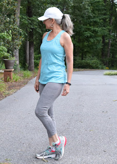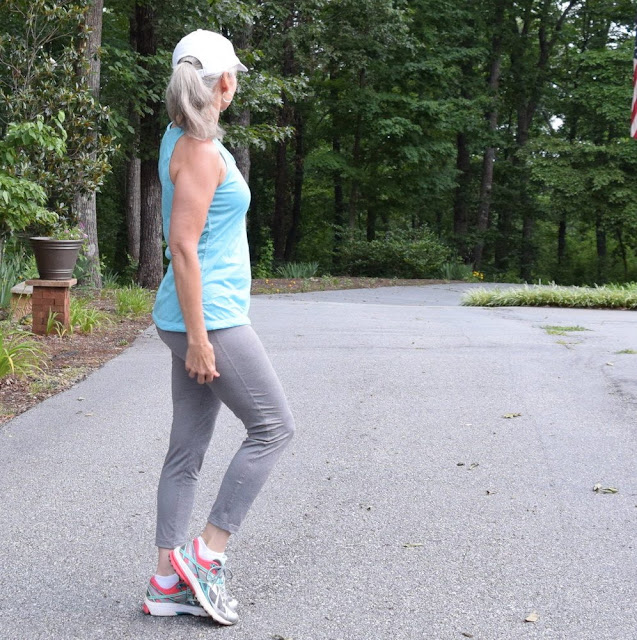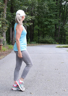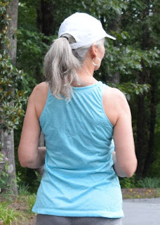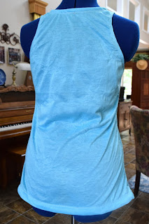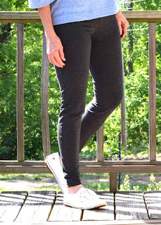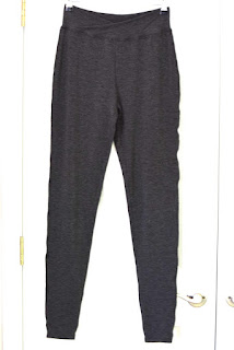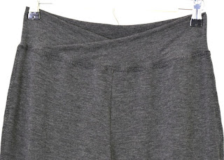 Back view. Here you can sort of see that the back waistband is shorter in overall width than the front. See how the front sort of wraps around there. LOVE this! The small of my back is so narrow and always a problem with clothes fitting properly.... so this hugs my back well, yet has enough room in the back crotch area to not grab or pinch the derriere. Another problem I usually have.