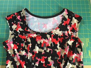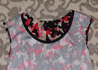 I expected this to be a quick and easy jumpstart to my mini-capsule wardrobe and this simple top turned into one big headscratcher and seam unpicker. I unpicked at least 5-6 seams before I got the finish I wanted. Below you can see a little of what I'm talking about. The pattern surprisingly has you simply turn both the neckline and armhole edges under 3/8", then another 3/8" and top-stitch/edge-stitch. I could not bring myself to even think about that sort of finish as I like things finished with bindings and facings. Once I got to the neckline application point, I also realized this neckline was perfect for me as it was. If I turned under the 3/8" + 3/8" I would lose @3/4" total and was concerned that would be too low. A sweet elderly lady at church recently gave me all her buttons, threads and misc. notions from when she used to sew..... and in that bag was a package of black woven pre-made bias binding. Perfect for my neckline as you only lose 1/4" in depth. So that's what I did. At first I wasn't sure I liked it as the neckline had a tendency to not lay flat, but let it be and I'm okay with that. A lot of how it lays has to do with how the shoulder seams sit on my shoulders in the proper place. This is really quite an elegant neckline design. Also below you can see the utterly pitiful job I did on the right armhole to you..... turning the 3/8" + 3/8" and top-stitching. It made me sick to look at that..... so I applied the black woven bias binding to the (left to you) armhole and found that though it looks nice in photos.... it sat awful on the body. All those seams were unpicked and I gave up and turned in the 3/8" + 3/8" and was super careful and top-stitching and....