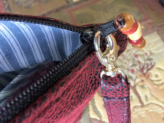 .....as well as the wristlet and found I do not like a wristlet at all. Also used an All Purpose Zip and though it works great 'zipping' open and shut, the small zipper head is puny. Even after adding some little wooden beads it just doesn't look right.