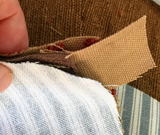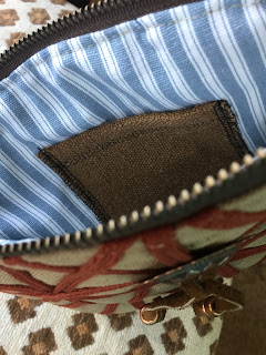 You can see here below in this fuzzy shot.... my dark brown zip has been cut just beneath where the stitching stopped and that left my long canvas tail. At this point cut your canvas even with your bag's sides. I got so excited that everything was working well I did not take anymore photos of this stage, but hope you get the idea.