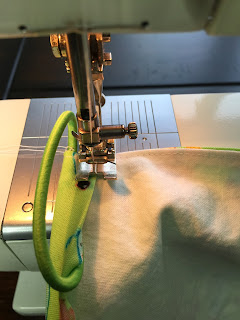 The way I chose to sew them in is how I've got my machine set up below. Both sides of the mask are left open, so I simply placed the elastic within the seam allowance and slowly, carefully stitched the seam closed encasing the elastic as I went.