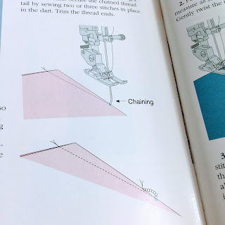 I've modified her technique a bit..... more because I was so excited to put in practice, I neglected to read all the details. ;) So here's what I did: Begin at the fabric edge, stitch toward the dart point and as you near the dart point, narrow your stitch length to the tiniest stitch length for the last few stitches. Stop as you stitch off the fabric and re-set your machine to a more normal stitch length. Now stitch maybe 3-5 stitches 'off' the fabric forming the little chain. Stop, then back-stitch your little chain into the body of the dart and snip the thread tails, as you can see below. That's it... You are done!