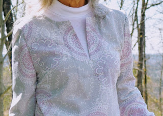 The pattern was mostly chosen because I'd recently made it, below, and knew it'd fit and more importantly be long enough in the back to cover the derriere well with the new pair of leggings/skinny pants I also made specifically for the special day.  I wanted to be comfortable with all the walking, stair climbing and getting around the Biltmore Estate without worrying about uncomfortable clothing concerns.