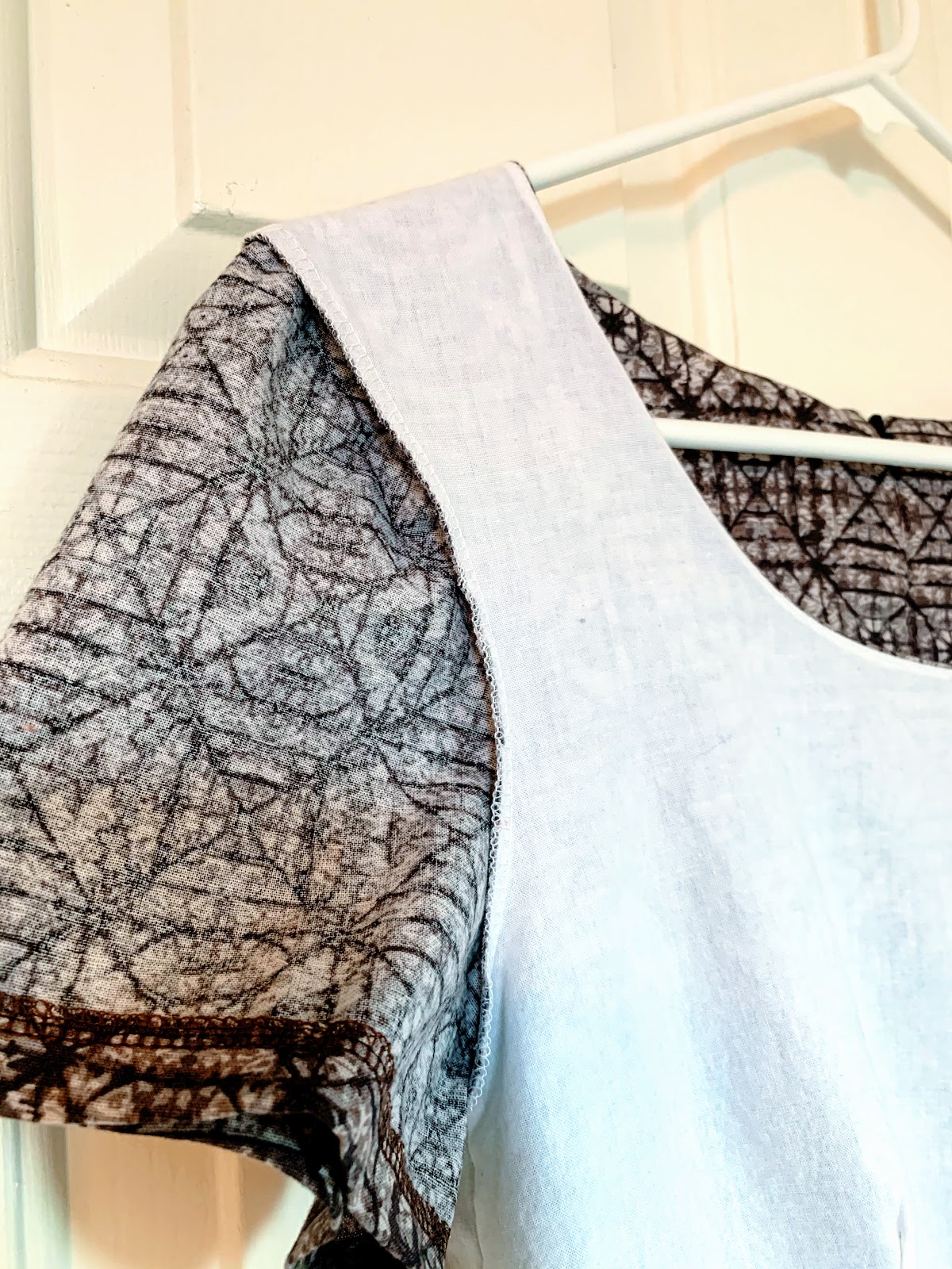 Took time first making all the modifications on a newly traced flat pattern.... beginning with the size Small...... then paid LOTS of attention to the fabric placement patterning.  Extremely proud of my work here.  This pattern only needs 1.5 yards.... but somehow I didn't buy that much, much less taking into consideration pattern placement..... so it was a miracle this all worked.  May I say literally a handful of scraps were leftover.  Front, below....