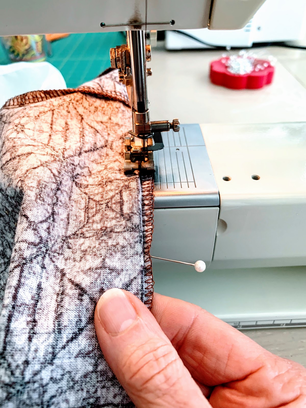 Finished the hem by machine stitching using the blind hem stitch and special blind hem foot for my machine.  My favorite method!!!  What I've found critical, is the placement of the pins.  See how I have mine pinned below.  Holds all in place beautifully, yet easy to pull out while stitching without messing up your stitching line.  Gee I thought I'd written a video tutorial post on how to machine stitch a blind-hem easily.... but cannot find it now.  I'll write a separate post on that soon for those who may be interested in how to conquer this intimidating technique easily.