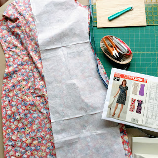 Remember last month when I shared that my friend needed a Mother-of the Groom dress for her upcoming son's wedding?  Well she ended up buying a beautiful dress she loved and that fit her perfectly so our attention turned to making a dress for the informal bar-b-que Reception Dinner that would be held in an historic venue.  She chose NewLook 6261 and this cute cotton fabric from her stash.  We spent a pleasant day altering the flat pattern to fit her 6' body, size 14 with 1" length added to waist, re-work vertical darts, 3" length added below hips, sloping right shoulder adjustment and now to work on fit from hips down.  You are looking at 6 hours worth of work, below.... though truth be told.... there was lots of talking and eating going on too.  ;)