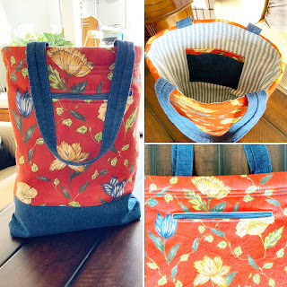 This bag was a joy to make completely inspired by the blue zip, bottom right below, that was in my friend's notions she'd given to me.  This was a 'thank you' to her made of denim, blue ticking and jacket fabric scraps from the stash.  I may do a proper blog post at a later time..... we'll see.