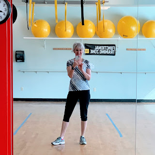 And another workout selfie.  If your Y has a large room used for groups, you might ask if they allow folks to use it when it is empty.  Mine does and I love having this large, well-equipped room with floor-to-ceiling mirrors all to myself.  The weights, tubes, mats, kettleballs and steps are off to the side and out of sight in this photo.... but it's great.