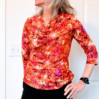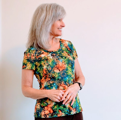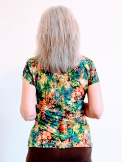 Hard to see, but a key element to a great fit with this pattern are the side seam gathers at the bust line. I do not gather these the conventional way, but ease them in by stretching the fabric as I sew between the dots. This is also how I put the sleeves in. Mimi G gave me this idea of easing in knit sleeves in one of her videos. Oh my goodness she made it look so easy. It's not hard.... but I take my time and sew s-l-o-w. By the way..... I love to watch youtube video creators like Mimi G and Brittany sew because even if I may not be making the garment they are sewing, it's great to learn from the pros!! Can you tell I took my time and tried to figure out the best fabric pattern placement, below. Receive compliments on this top every time I wear it and believe it's the fabric that catches folks' eyes.