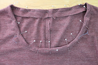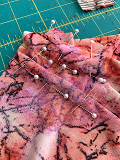 Even though the knit did not 'mark' well, still tried to mark the pleat lines to the best of my ability, then carefully pinned those lines with vertical pins noting the sewing line. The horizontal pins are keeping the knit from sliding.... with the last horizontal pin noting where to stop sewing. Was very pleased with the pleating on this.