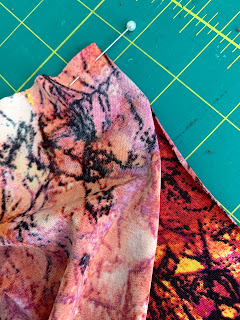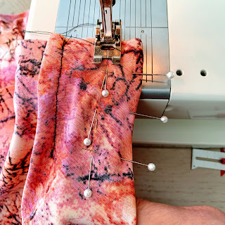 Was zooming right along and began pinning side seams together when I realized I was dealing with horrible curling. As in the curling one would see across the grainline..... not curling one would see on a knit cut along the grainline. Pulled some of the selvedge scraps to check my cuts and yep.... you guessed it.... I cut the fabric completely opposite the grainline of what it should've been. *sigh!* You'd think after sewing my clothes consistently since 2013 I'd be immune to making a 'newbie' mistake like this..... but nope..... mistakes happens to all of us, no matter how long we've been at it. Okay. Now what to do. Luckily in this case, this was a super stretchy 4-way stretch knit, with all directions of stretch pretty much equal. Whew! So I continued. And it was a real pain to pin these curling side seams straight. ;(