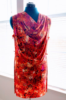 The sister fabric in the orange-red colorway made Simplicity 1716, below. This green colorway was supposed to be another top like the Simplicity, but could not bring myself to manage those 6 pleats again in this slinky knit.