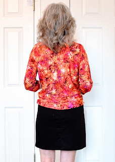 Wish I'd paid better attention to evening up the flowers on the back. There's an invisible zip back there with a hook and eye waistband closure. Unlined with serged seams meant a pretty quick make. Fabric is a polyester something pulled from the stash but originally purchased at my local open-only-once-a-month-fabric textile outlet center.