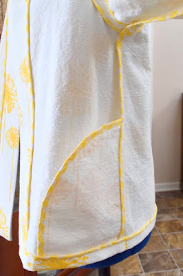When I first saw this corn yellow dandelion screen print on cotton slub duck, I immediately knew it would be a Pilvi Jacket from the book Lotta Jansdotter Everyday Style. If you click on the book's link, it takes you to Lotta Jansdotter's website where you can see photos of the jacket and her other designs.