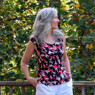 Having made so many Burda and Ottobre patterns lately with lots of tracing, I was super excited to use an already printed pattern..... and still ended up tracing!!! Fitting is one of my goals for this year so after lots of measuring the flat pattern, I realized it needed modifications and I felt more confident building those alterations off a traced pattern than on the original pattern. Basically I cut a size 8 and graded to size 10 at hips. Sewed 5/8" seams. Lengthened 2". This top is very short!!Princess seams front and back, cut on cap sleeves with a slight flare from the waist down, I just knew this would.... should..... be a flattering fit on my body type. We are still super hot and humid here in South Carolina with temps hovering around 90* F, so this is a perfect top to transition to Fall. I built my mini-capsule wardrobe around the colors in this fabric. Fabric came from All About Fabrics, my local textile outlet center. Love that place!!